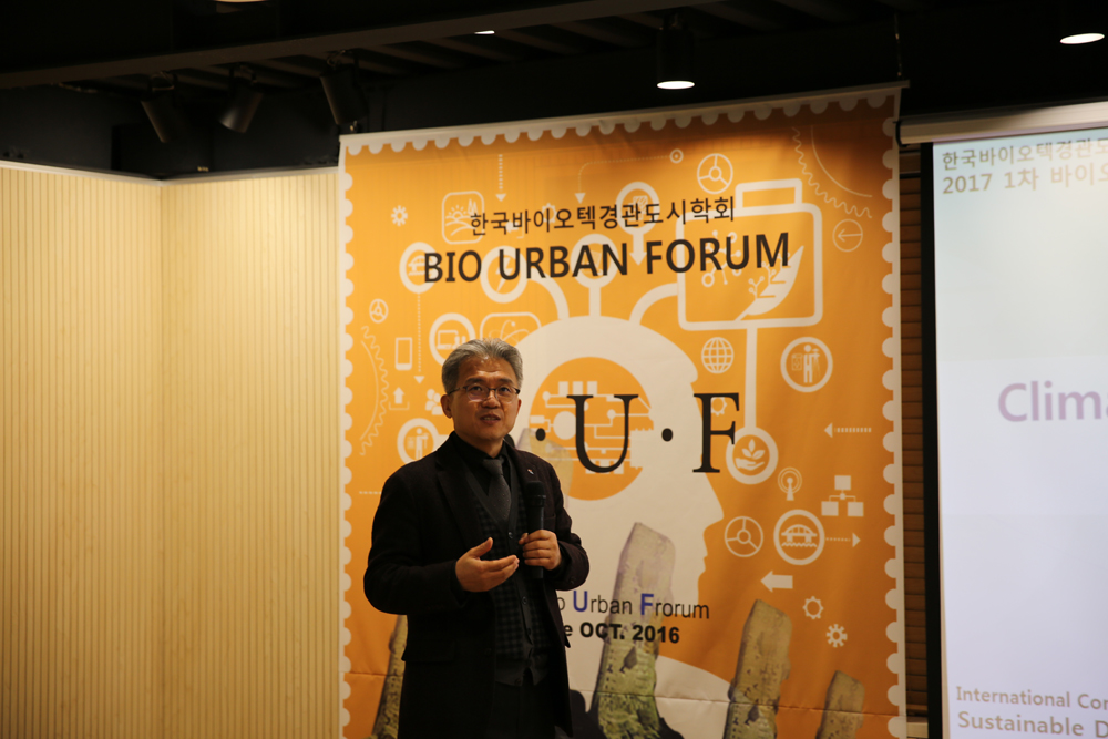 바이오도시포럼은 다분야간 트렌스와 융합을 통해 생명도시 만들기를 위한 담론을 생성하고 다양한 분야의 전문가들이 정보공유와 토론을 통해 나온 결과물을 공론화 시키는 자리입니다. 포럼은 학회장 조세환 교수의 개회사로 시작 되었습니다.